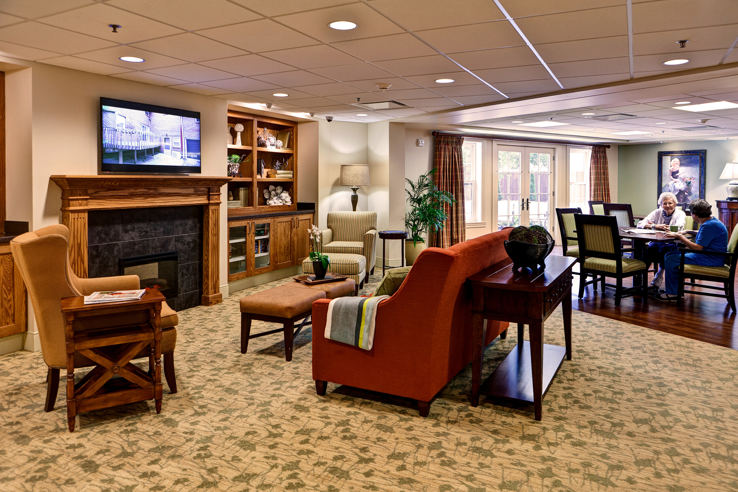 A hospitality alcove with the look and feel of a bistro came to the top of the list. The bistro added a refrigerator, microwave, ice machine, dishwasher and sink to the space. These amenities have provided support for residents to engage in many different social activities from a birthday party to watching the super bowl and everything in between. Through the use of materials and color this social hub was visually divided into two distinct areas; one zone that serves as a lounge space with an entertainment center and fireplace, and another that serves as the hospitality zone where the bistro alcove is located.