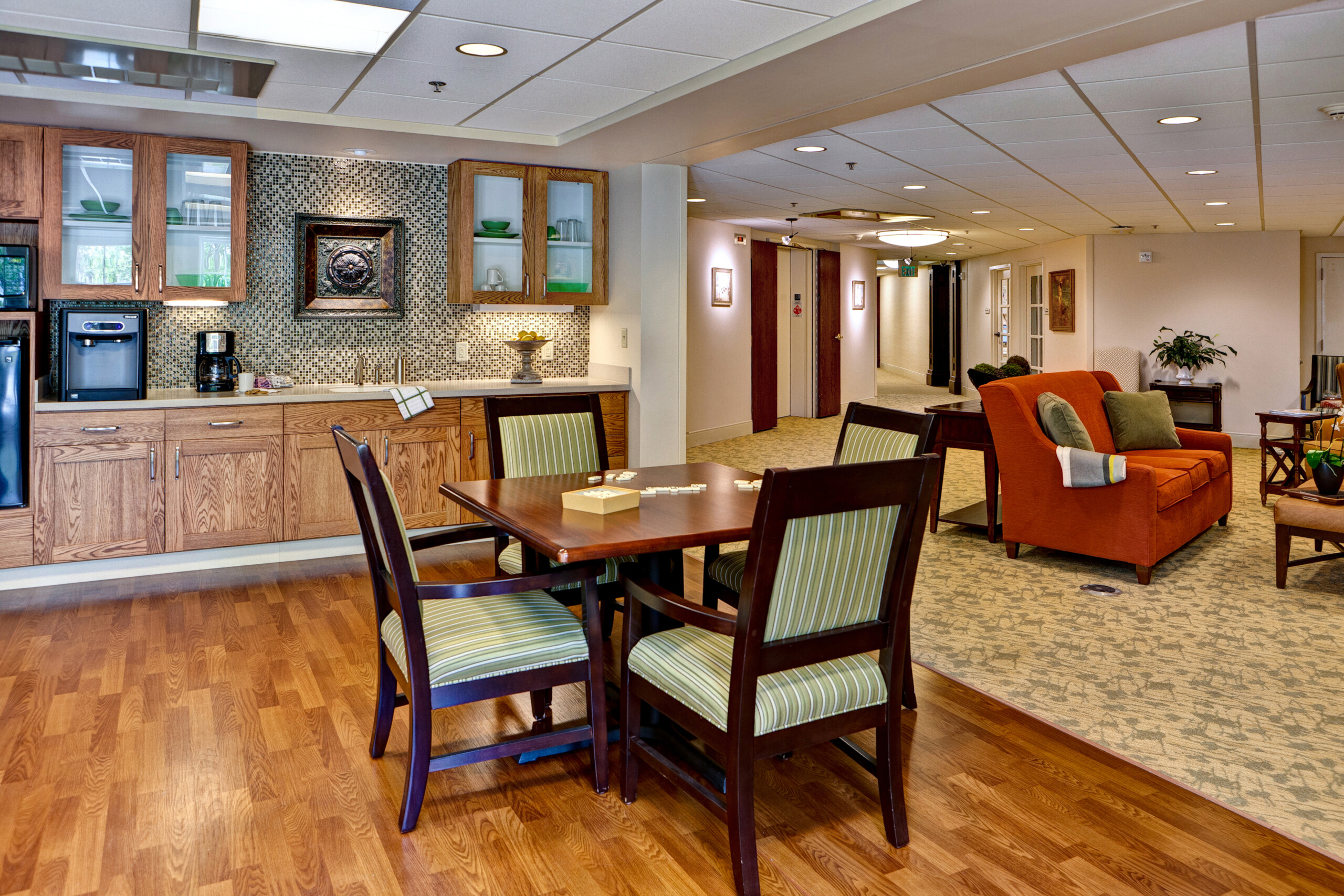 In order to establish the priorities for the remodel, a participatory process of 75+ stakeholders was utilized in the planning. Participants included executive leadership, staff, residents, resident family members, designers and contractors. Residents and family members were very outspoken that the renovated core space should be better connected to the adjacent outdoor areas both visually as well as through convenient circulation. Due to structural constraints it was impossible to install an opening in the small span of the existing exterior wall. Therefore, the decision was made to capture one of the adjacent apartments. This allowed for the installation of a set of French doors and large sidelights that would welcome the morning and early afternoon sun.