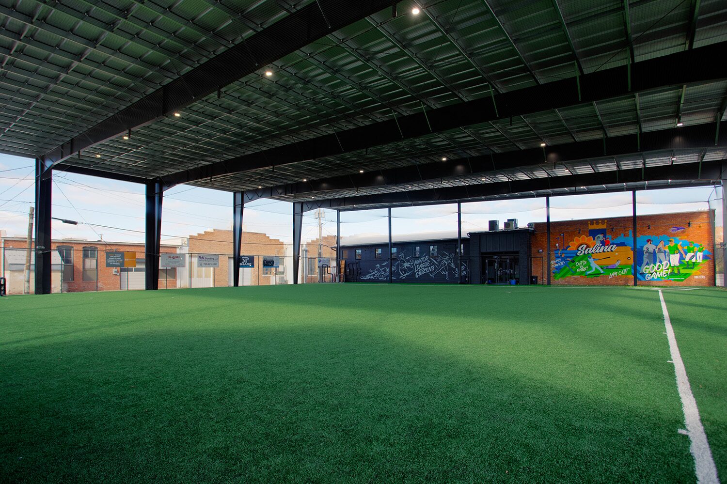 The Salina Baseball Academy provides baseball training and practice facilities to the city of Salina, Kansas. The facilities were designed to fit within existing buildings in downtown Salina, and include pitching facilities, batting cages, and a covered practice diamond.